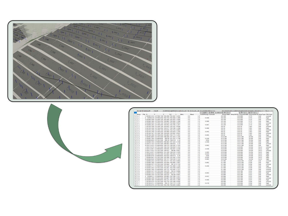 当リストには杭座標以外にも、杭突出長や架台/杭種別も記載しており、部材管理に使用できる資料をご提供いたします。