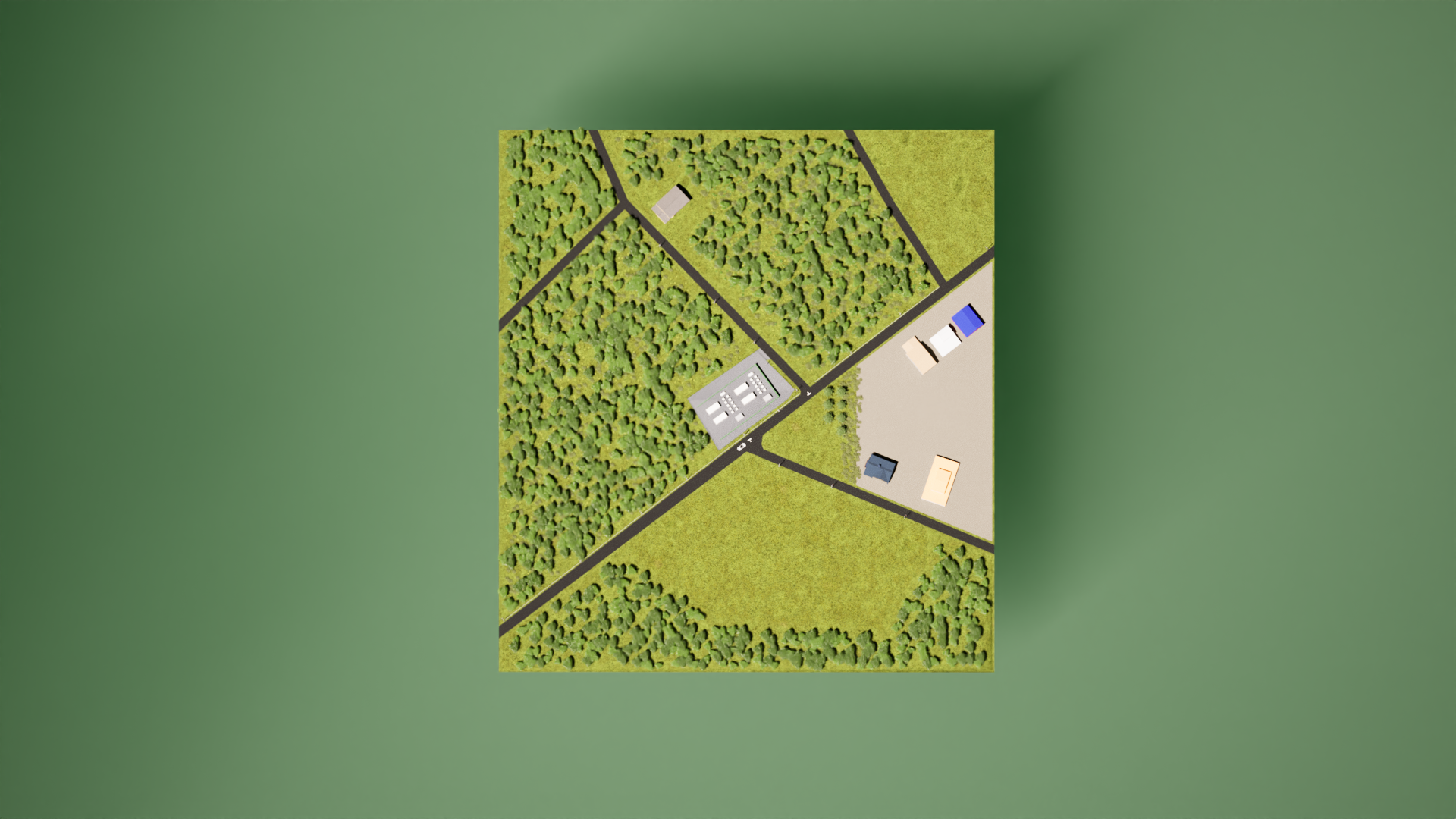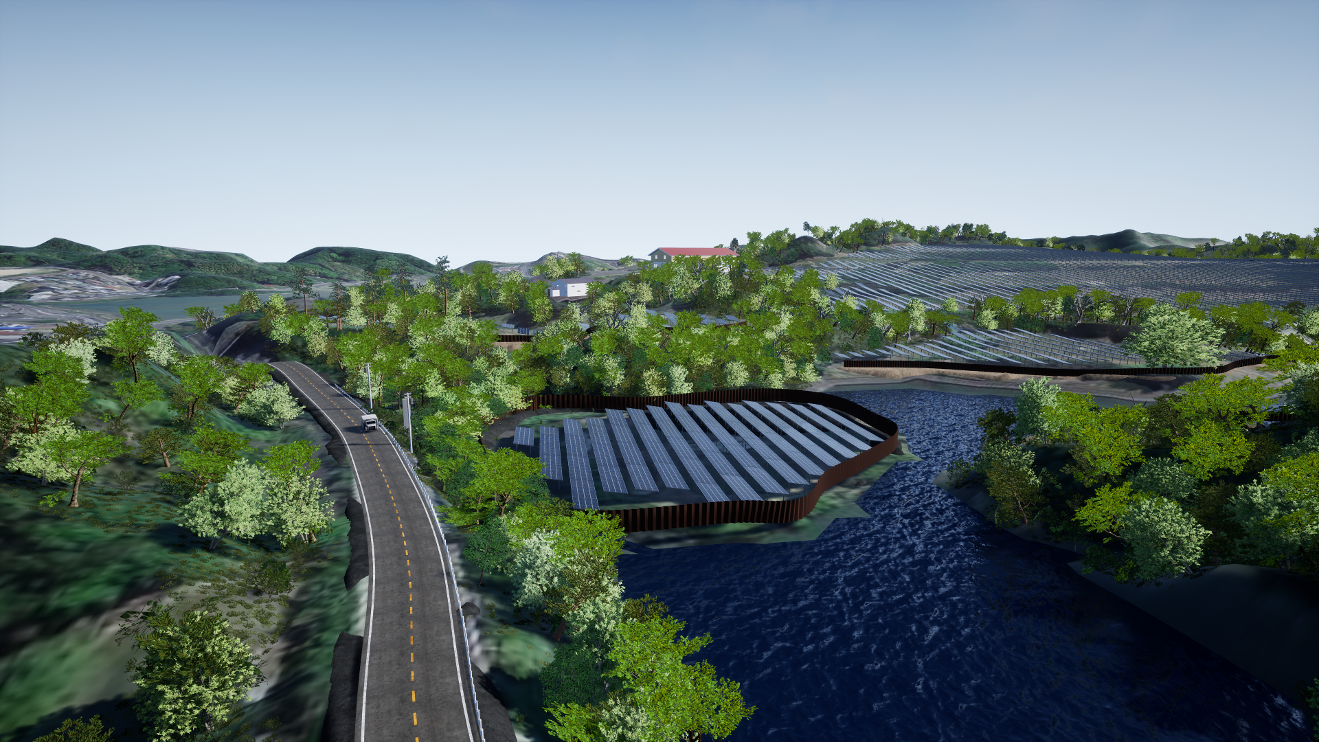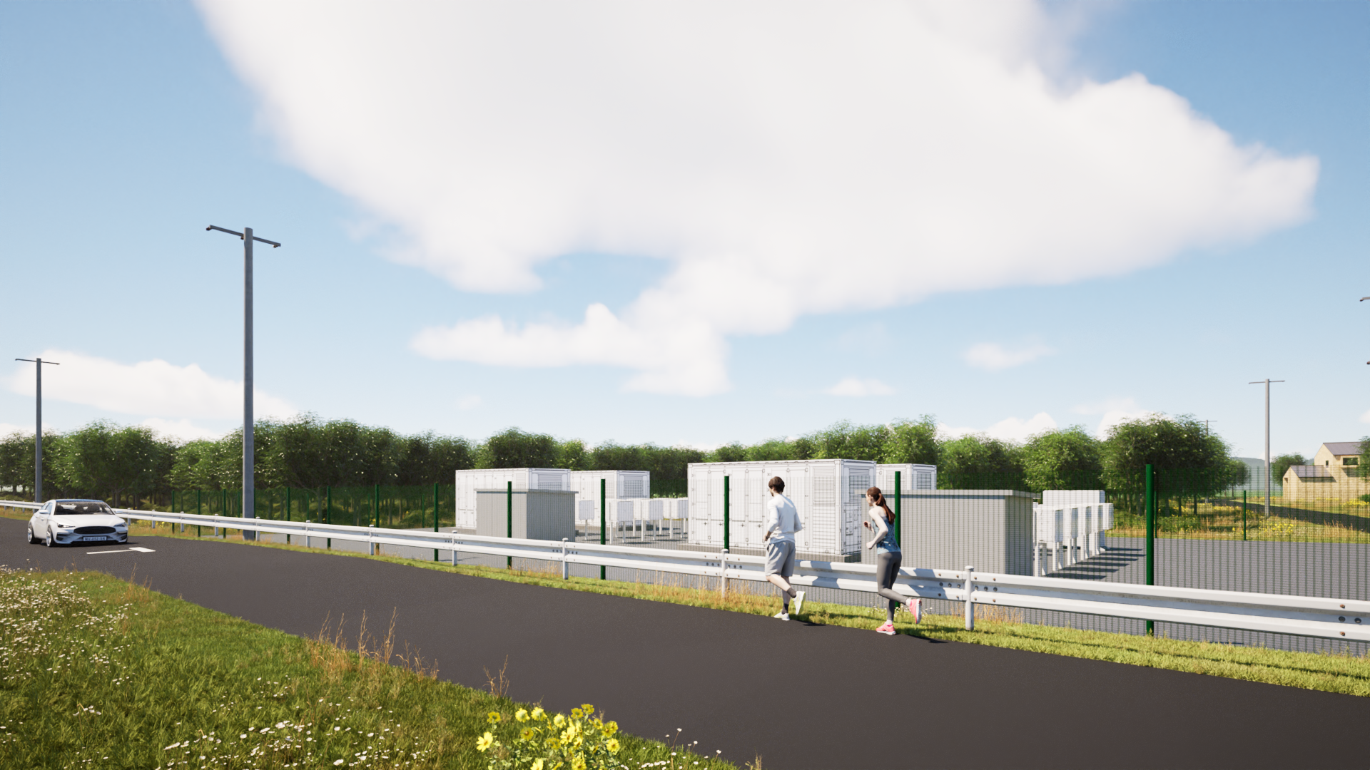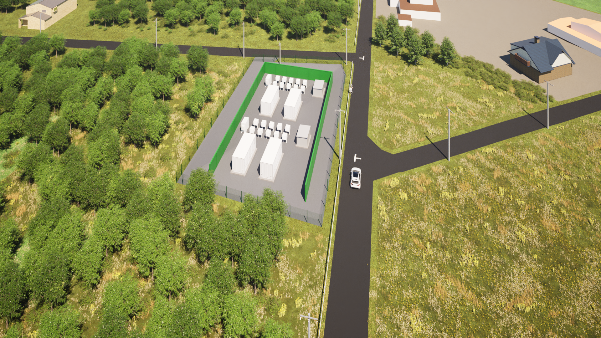 太陽光・BESS設備に加え、周辺の建物・樹木なども含めて3Dモデル化し、レンダリングで完成予想図を作成します。