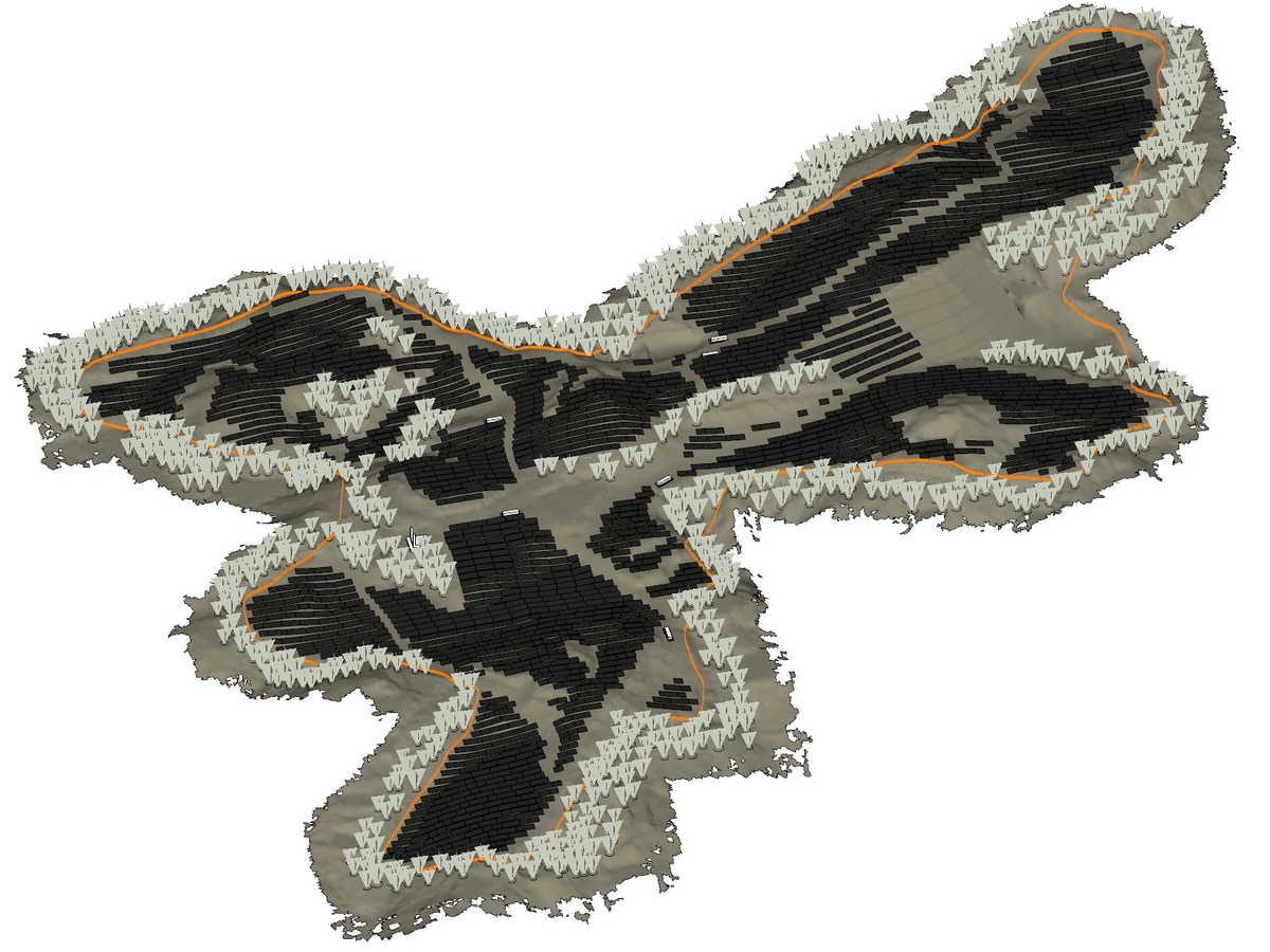 事業区域内の架台や樹木、PCS、インバータなどの構造物をモデル化して、時間帯ごとの陰影のイメージを出力します。パネルへの影の影響を減らすために樹木の伐採を検討されている場合は、影響度の高い樹木を選定することも可能です。